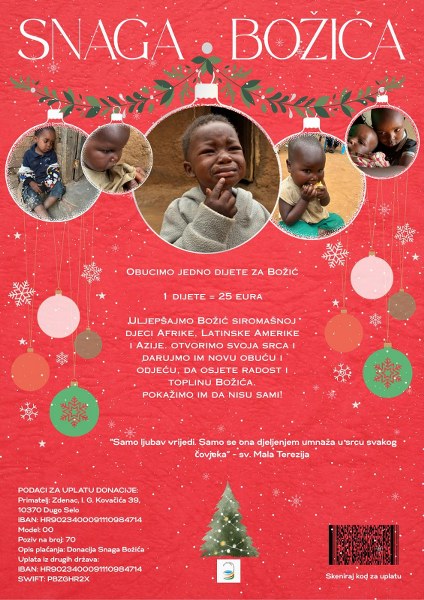 Djeca koja odrastaju na samom rubu siromaštva, koja ne poznaju toplinu doma ni radost obitelji. Mnogima od njih nedostaje ono najvažnije - ljubav. Ove božićne dane otvorimo svoja srca i pronađimo mjesta za jedno takvo dijete. Budimo MI “Snaga Božića” koja će djeci Afrike, Latinske Amerike i Azije pomoći da otkriju pravo bogatstvo Božića i da osjete da imaju obitelj koja za njih brine.