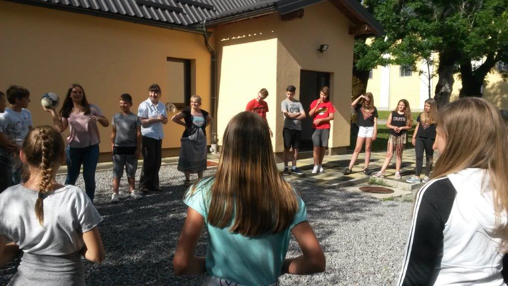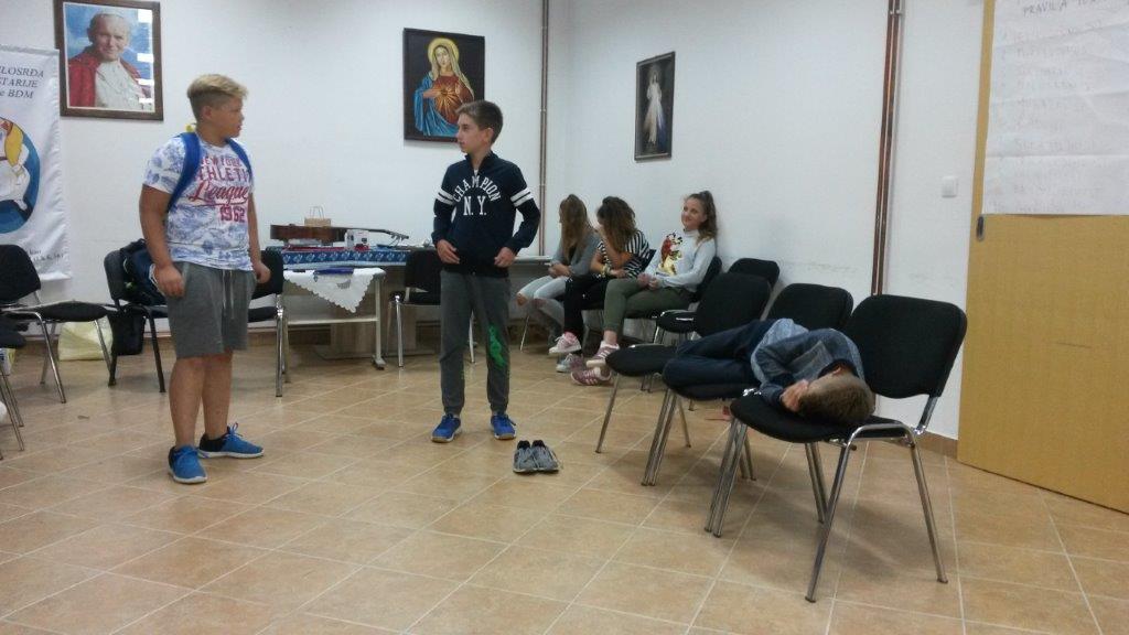 Naša Ljetna misijska škola započela je molitvom, a onda smo upoznali našu zaštitnicu sv. Mariju Krucifiksu di Rosu. Kroz igrokaz o djetinjstvu i mladosti, djeca su istovremeno upoznavali i usvajali pozitivne osobine i kreposti Paole di Rosa. S velikim zanimanjem i raspoloživošću su vježbali scene i samo u dva dana zapamtili i tekst.