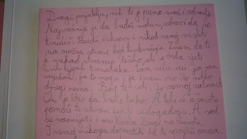 znam da vam je teško i da živite u strašnoj zemlji. Nadam se da će te doživjeti i osjetiti ljubav Kristovu i saznati mnogo stvari o tom najboljem prijatelju ljudi. Želim da uživate u životu i da znate da ste pozvani baš takvi biti i tako živjeti. Jer Isusu nije važno odakle si, važno je kakav si čovjek i s kojom radošću primaš njegovu vijest. Čuvajte se i volite baš kao što je Isus nas volio i pazio. Sretan i radostan Božić! Karla